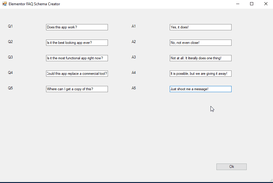 Enter in all of your questions and answers that you would like to have wrapped in the FAQ schema, then click ok. In the folder your script is saved to you will see 5 txt files.