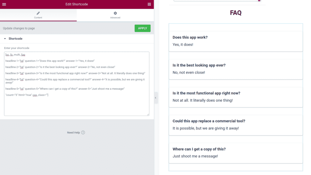 As soon as you paste your schema contents into the shorcode window your FAQ section will appear. This schema wrapping will help you to get noticed by Google, and should allow you to do other cool things like win the snippet in Google search!